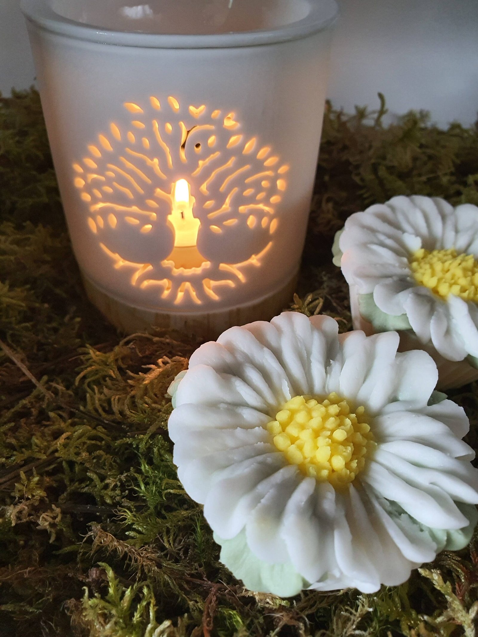 Julie réalise cette fleur à la main sans moule, pour vous offrir un fondant ou une bougie parfumé et unique. La cire de soja ne requiert pas de pesticide pour sa production et est garanti sans OGM.