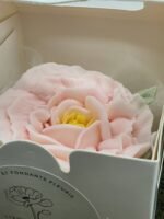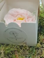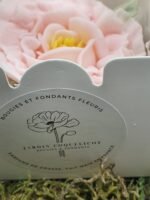 Julie réalise cette fleur à la main sans moule, pour vous offrir un fondant ou une bougie parfumé et unique. La cire de soja ne requiert pas de pesticide pour sa production et est garanti sans OGM.