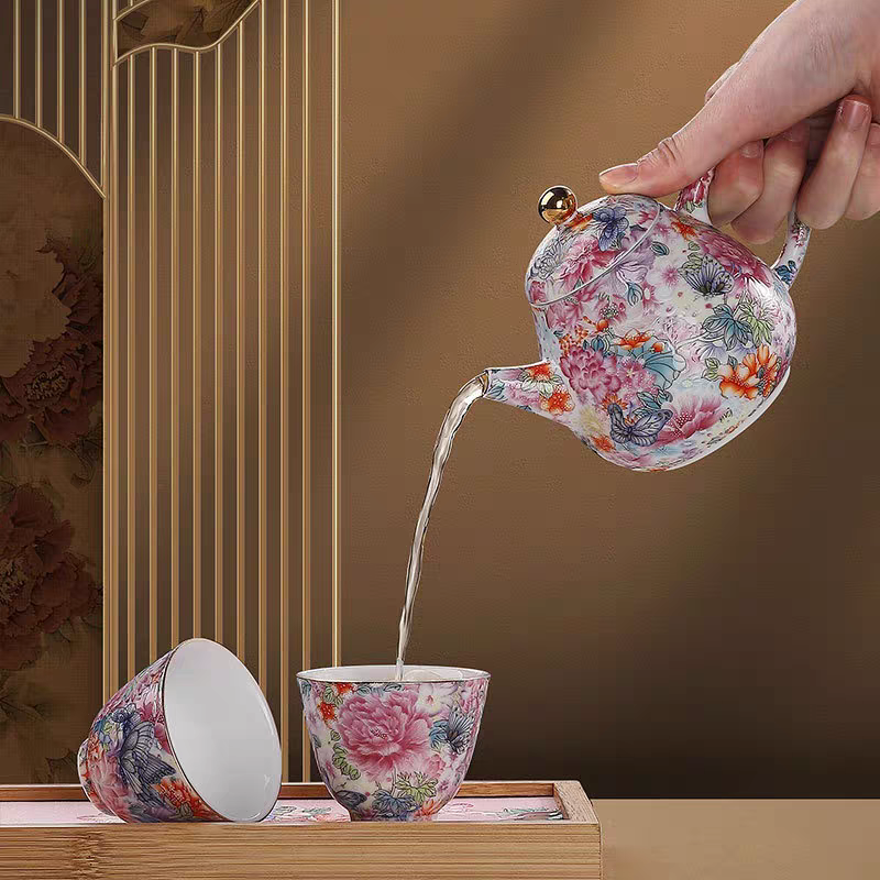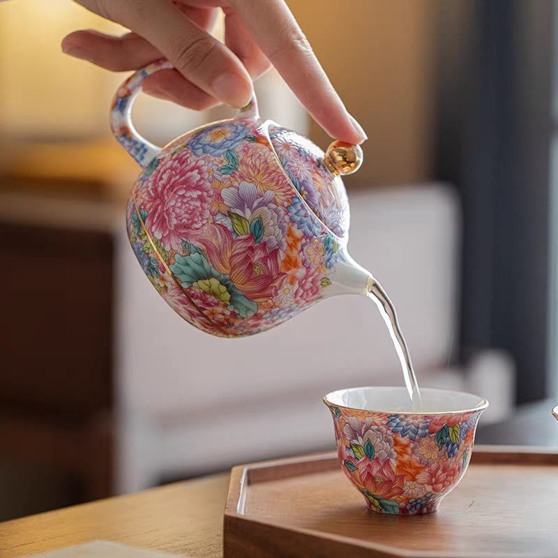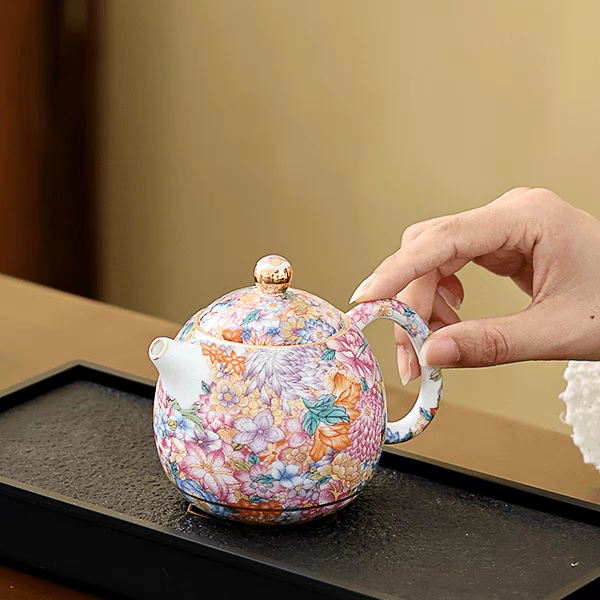 - Décor émaillé « Mille Fleurs » rehaussé, symbolisant la prospérité et la beauté éternelle.