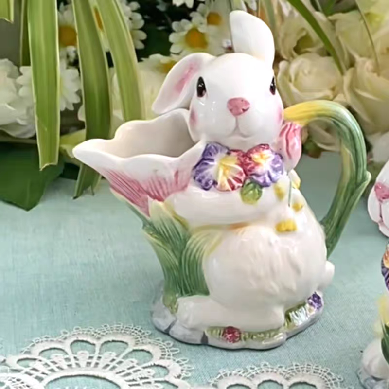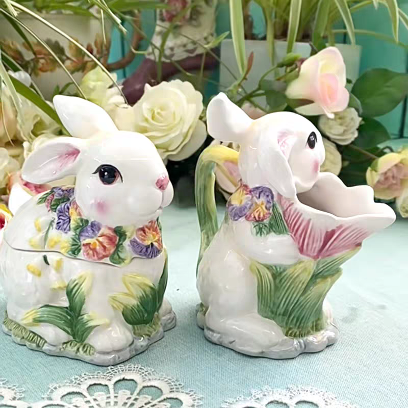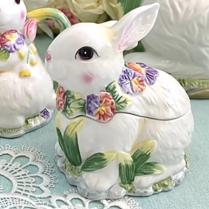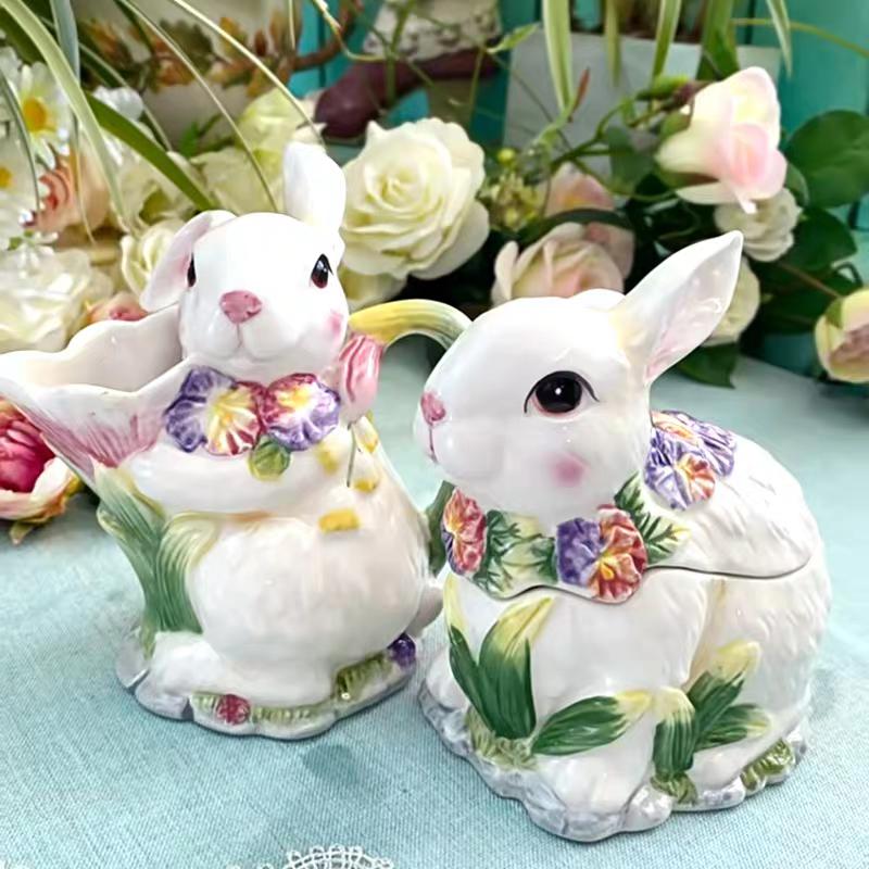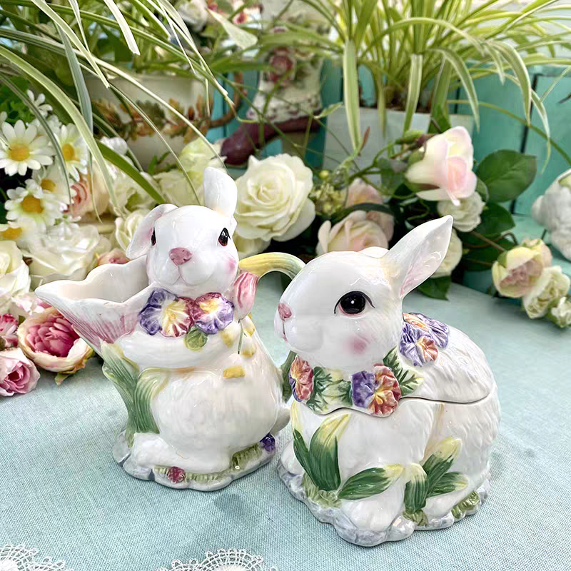 Adoptez notre délicieux duo de lapins en céramique, une création aussi adorable qu’utile, parfaite pour apporter une touche de douceur à votre intérieur. Composé d’une boîte à couvercle et d’un pot à bec verseur, cet ensemble allie parfaitement esthétique et praticité.