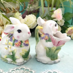 - Thème : Lapins coquins portant des colliers de pensées (fleurs tricolores)