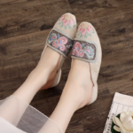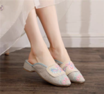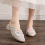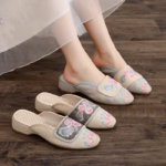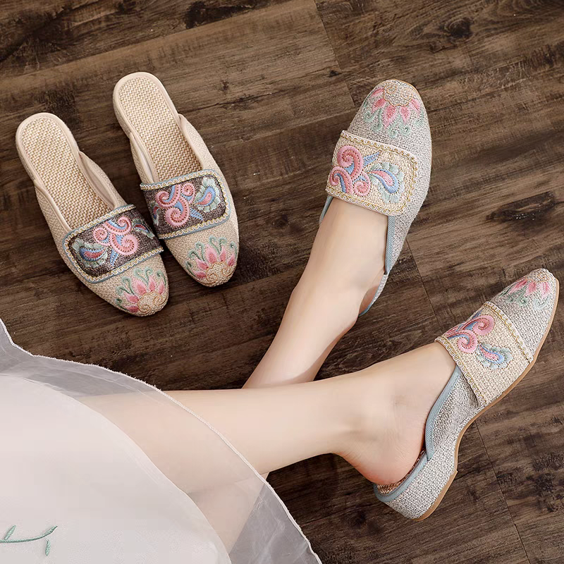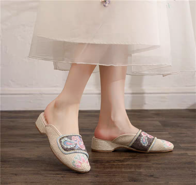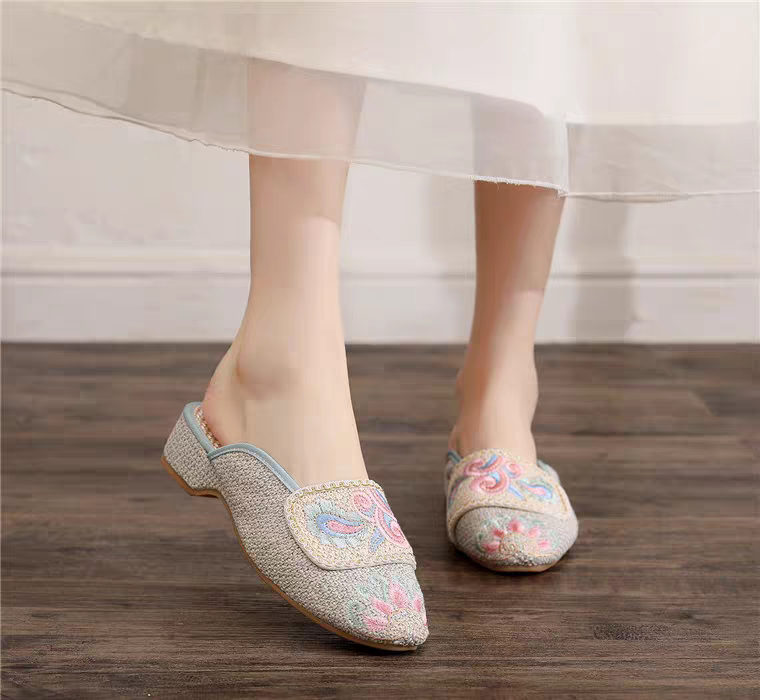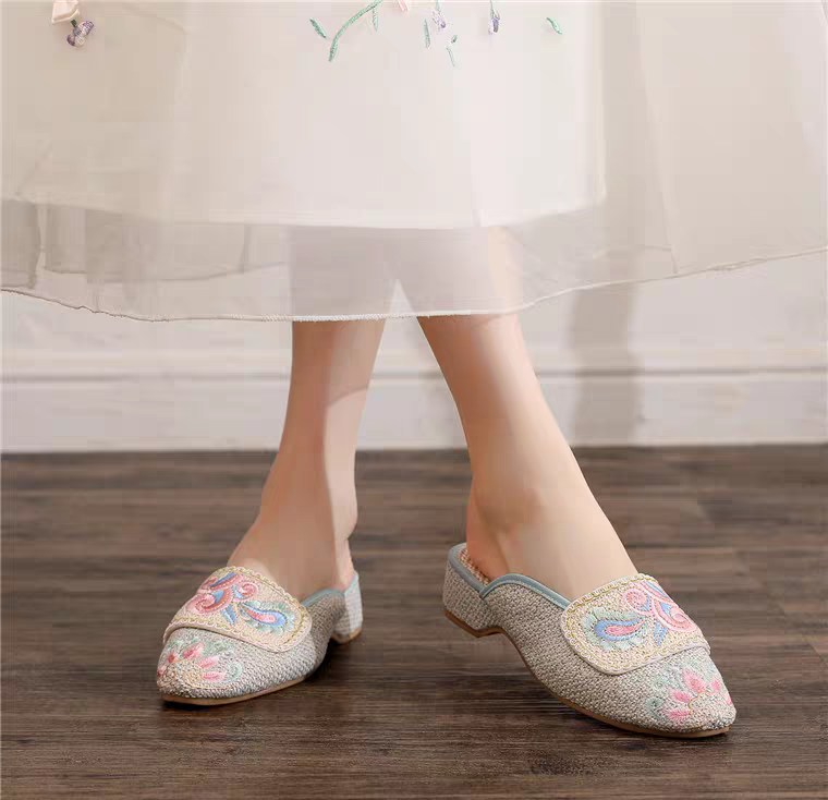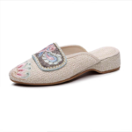 Admirez nos mules en lin rehaussées de broderies artisanales minutieuses. Chaque paire est une œuvre d'art unique, ornée de motifs floraux ou géométriques inspirés des savoir-faire traditionnels.